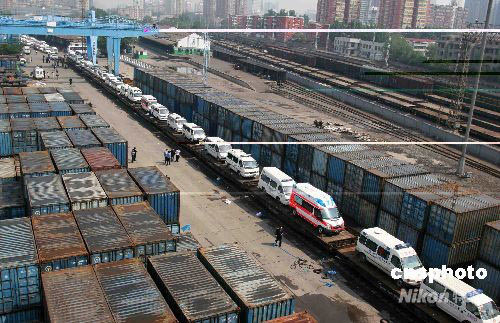 5月15日,由北京市衛(wèi)生局組織的70輛救護車和3輛指揮車,滿載救災(zāi)物資從北京廣安門火車站駛出,奔赴四川地震災(zāi)區(qū)。中新社發(fā) 富田 攝