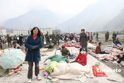 5月15日,等待救助的汶川縣災民。由于陸路交通尚未恢復,重傷員只能等待直升機轉運到成都救治。中新社發 張雷 攝