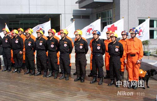 五月十六日下午,由臺灣紅十字會組織派遣的救援隊一行二十二人和一只搜救犬將乘包機直飛四川救災。圖為戎裝即發(fā)的搜救隊和搜救犬。作者:陳立宇