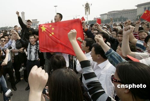 2008年5月19日14時31分,默哀結束后,在北京天安門廣場的近萬名民眾仍然聚集在一起,手持國旗和菊花,高喊:“加油四川!加油中國!”中新社發 李剛 攝
