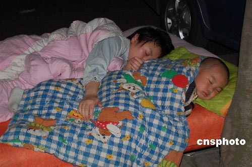 5月20日凌晨,四川成都眾多市民紛紛露宿街頭防止余震傷害。四川省地震局19日晚發出公告稱,汶川余震活動水平為6—7級左右,5月19日至20日汶川地震區附近余震發生的可能性較大。中新社發 劉萬強 攝