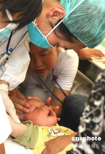 5月26日,由德國援助的“中德紅十字會野戰(zhàn)醫(yī)院”在四川大地震的重災(zāi)區(qū)都江堰開始接待傷病員。該醫(yī)院由德國紅十字會緊急提供一個全套野戰(zhàn)醫(yī)院設(shè)備和11名醫(yī)療技術(shù)專家,由中國紅十字會組織上海華山醫(yī)院、四川相關(guān)醫(yī)院的醫(yī)務(wù)人員接診傷病員,野戰(zhàn)醫(yī)院由手術(shù)室、產(chǎn)房、急診室、放射室、實驗室和藥房組成。圖為一名在地震中幸運脫險的半周歲男童,由于多日在防震棚中生活染上不適癥并發(fā)生呼吸緊迫癥后被緊急送到該醫(yī)院搶救。中新社發(fā) 任晨鳴 攝