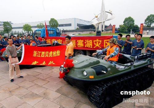5月30日上午,浙江義烏,兩輛“西貝虎”水陸兩棲全地形車啟程前往四川北川唐家山堰塞湖搶險。目前唐家山堰塞湖的總儲水量已達1.4億立方米,而且每天以500立方米的速度遞增,一旦發(fā)生潰壩,將危及下游130多萬人的生命財產(chǎn)。28日剛從什邡回來的義烏西貝文良特種車輛有限公司領(lǐng)導,又接到唐家山堰塞湖防洪搶險指揮部急需用水陸兩棲全地形車電話。該公司連夜組織加班,突擊生產(chǎn)了兩輛性能最優(yōu)的水陸兩棲全地形車,并根據(jù)唐家山堰塞湖搶險可能遇到的困難,增配了自動牽引鉤、牽引鋼絲繩、爬坡履帶、水上推進的螺旋槳等。30日中午,陳根林等四名剛從什邡抗震救災(zāi)前線回來的公司職工,組成“西貝虎”搶險突擊隊,再赴抗震救災(zāi)前線搶險。中新社發(fā) 張建成 攝