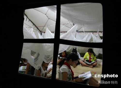 6月2日晚,解放軍總裝備部援建的綿陽八一帳篷學校,地震災區的孩子們刻苦學習,追補因地震災害失去的寶貴學習時間。
