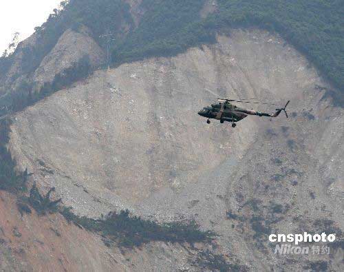 6月12日上午,據四川省軍區抗震救災指揮部消息,有關方面已從直升機失事地點向映秀鎮運回第二批飛機殘骸,目前由成都軍區陸航團的另一架米-171直升機緊急運往成都。中新社發 賈國榮 攝
