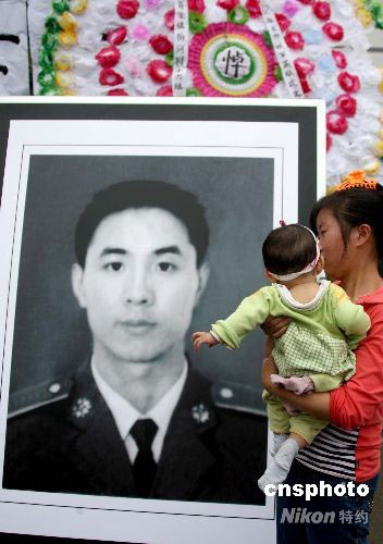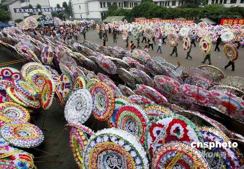 6月21日,在都江堰市胥家鎮抗震英雄武文斌烈士的靈堂前,各地群眾敬獻的花圈已達兩千余個,數千民眾自發來到抗震英雄武文斌烈士的靈堂前進行悼念。26歲的濟南軍區“鐵軍”部隊炮兵指揮連二期士官武文斌,因連日救災勞累,于6月18日4時45分犧牲。6月21日,濟南軍區某集團軍作出決定,為犧牲在抗震救災第一線的某紅軍師實習士官學員武文斌追記一等功,并批準為烈士。中新社發 曾憲平 攝
