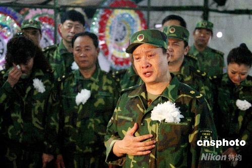 6月22日,閻維文、黃宏、夢歌、蔡國慶、白雪等著名軍旅藝術家來到四川都江堰悼念抗震救災烈士武文斌。圖為閻維文在烈士的遺像前清唱一首《心肝情愿》告慰英靈。中新社發 曾憲平 攝