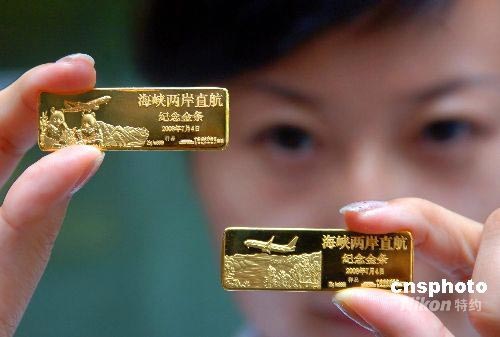 7月1日,由中國國家博物館藝術(shù)品開發(fā)中心權(quán)威監(jiān)制國道黃金發(fā)行的“海峽兩岸直航紀念金條”在北京亮相。2008年6月13日上午,海峽兩岸關(guān)系協(xié)會會長陳云林與海峽交流基金會董事長江丙坤在釣魚臺國賓館簽署《海峽兩岸包機會談紀要》,兩岸周末包機將于7月4日起正式啟航。黃金全國僅限量2008套,全套包括2根25克AU9999金條。第一根金條的主畫面是空中客機、中國大熊貓及“團團圓圓”字樣;第二根金條主畫面是空中客機和臺灣阿里山風(fēng)景。金條背面是關(guān)于《海峽兩岸包機會談紀要》的簽署情況概述。中新社發(fā) 鄒憲 攝