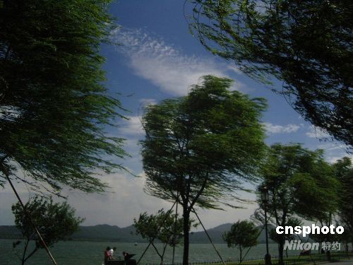 7月28日,山雨欲來風滿樓,受今年八號臺風“鳳凰”的影響,往日寧靜的杭州西子湖畔狂風大作,白堤上的柳樹“狂舞”不斷。中新社發 柴燕菲 攝