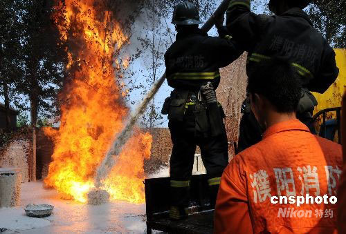 8月28日,河南濮陽市疙瘩廟村一家地下非法小煉油作坊在廢油加工時,操作不慎引發(fā)火災。大火炙烤著現(xiàn)場10多個裝滿易燃品的原料罐,并威脅著周圍群眾的生命財產(chǎn)安全。濮陽市消防支隊華龍區(qū)大隊官兵接報后,迅速趕到現(xiàn)場,經(jīng)過1小時激戰(zhàn),終將大火撲滅。中新社發(fā) 劉敬寬 攝