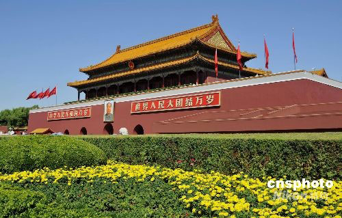 9月1日,北京奧運會后,天安門城樓重新粉刷裝飾一新,在藍天鮮花的陪襯下,更顯雄偉壯觀,迎接殘奧會即將到來。中新社發 王宇婷 攝