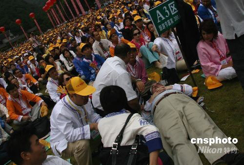 9月12日上午,2008年中國(guó)湖南國(guó)際旅游節(jié)在張家界國(guó)家森林公園開(kāi)幕,湖南借助國(guó)際旅游節(jié)這一機(jī)遇向世界展示自身獨(dú)特的旅游資源和旅游產(chǎn)業(yè)發(fā)展?fàn)顩r。500余名境內(nèi)外旅行商和媒體記者受邀觀看開(kāi)幕式表演,一位胖老外坐著看覺(jué)得不舒服,直接躺在草地上,引起了一場(chǎng)小誤會(huì)。中新社發(fā) 張家根 攝