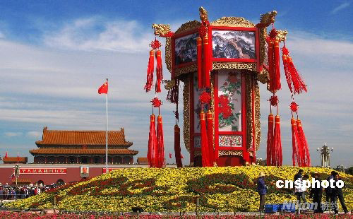 9月25日,北京天安門廣場“普天同慶”繁花錦簇的十一國慶花壇布置工程進入了最后收尾階段。廣場東側的5個福娃花壇與中央9.9米高的民族傳統宮燈花壇相映成趣。中新社發 鄒憲 攝
