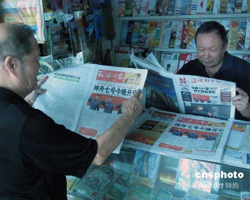 9月25日,福州市民通過閱讀國內多家報紙在頭版刊登“神七”飛船于當日晚間擇機發射的消息,關注3位“神七”航天員。中新社發 劉可耕 攝