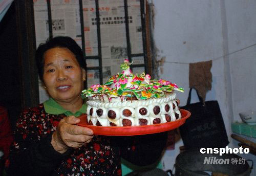 9月25日下午, 在山西運城市鹽湖區安邑街道辦事處楊家卓村景海鵬的老家,前來到賀喜的親戚朋友和當地政府代表絡繹不絕。圖為景海鵬的母親王珍玲特意為景海鵬做的“神舟七號”形狀的棗糕。中新社發 張雷杰 攝