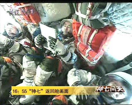 北京時間9月28日下午16時55分許,神舟七號三名航天員即將返回地球,他們已經穿好艙內航天服,神態安詳平靜。