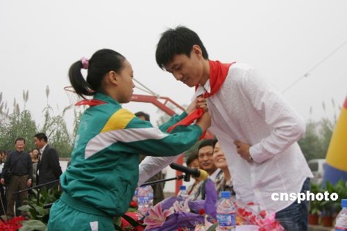 2008年10月19日,北京奧運(yùn)佩劍冠軍仲滿回到家鄉(xiāng)母校江蘇海安縣大公鎮(zhèn)北凌小學(xué)和北凌初中,回顧自己獲得冠軍的歷程,并為師生簽名、合影,感謝母校對(duì)他的培育。中新社發(fā) 江蘇-徐瑞平 攝