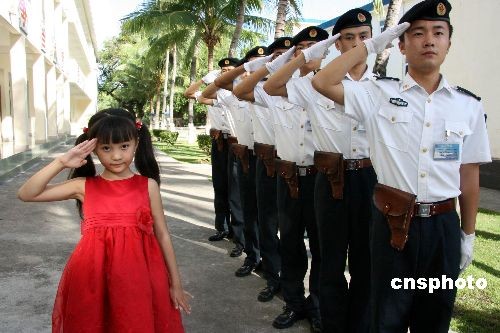10月21日下午,在北京奧運開幕式上一曲成名的小女孩林妙可,利用參加三亞城市精神評選活動暨奧運冠軍三亞行晚會之際,來到海軍駐南國三亞某保障基地標桿式單位警勤邊參觀。到該連后,林妙可在趙勛兵副連長的帶領下,參觀了連隊內務、健身房、榮譽室。中新社發 郜宏亮 攝