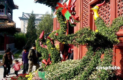 11月1日,為期20天的第29屆北海公園菊花展在北京皇家園林北海闡福寺開幕,2008北海公園菊花展以“鳳舞金秋妍”為主題,共展出500余個品種的2萬多盆菊花,主展區(qū)采用鮮切花方式裱扎楷、草、篆、隸四種不同字體的“菊”字,并設置六大展室,展出的品種有大立菊、盆景菊、懸崖菊、造型菊及藝菊小品等。中新社發(fā) 錢興強 攝