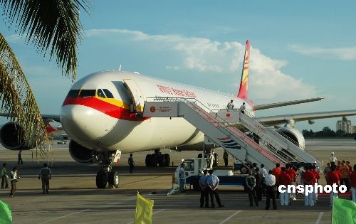11月5日,海南航空首架空客A340—600飛機從香港飛抵三亞鳳凰國際機場。此次海航引進的A340-600機型,是巨型寬體客機,客艙為3艙布局共288座,頭等艙8座,公務艙60座,經濟艙220座。飛機安裝的最新型空氣循環系統和過濾裝置,可使艙內空氣與外界完全對接,從而保證機艙內空氣潔凈清新。據悉,這是海南航空目前投入市場最豪華的飛機,今后將執飛三亞至北京航段。圖為海南航空當日在三亞鳳凰機場為空客A340飛機的到來舉行的接機儀式。中新社發 尹海明 攝