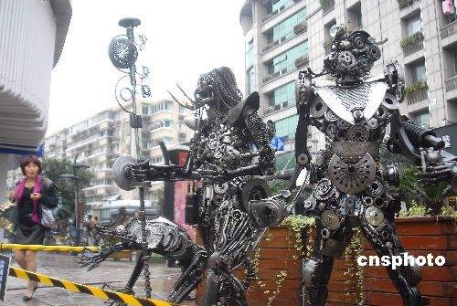 2008年11月8日,鋼鐵俠、怪獸、恐龍、大蟒蛇等9個“鐵家伙”集體出現在杭州街頭。它們由藝術家周峰用廢棄的零配件制成,參加以“我·機器人、創意在武林、創意成就品質生活”為主題的“西湖創意市集”武林路站活動。 中新社發 引煒 攝
