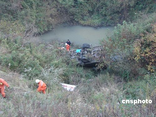 11月12日下午5時許,一輛從貴州省六盤水市駛往畢節地區威寧縣的貨車在102省道威寧縣境內張家村一轉彎道突然失控,一頭將路邊的防護石墩撞垮,翻下50余米高的山谷,當場造成2人受傷,1人遇難。中新社發 潘立遠 攝
