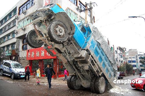 1月7日,貴州省福泉市一輛嚴重超載的汽車在某道路倒車時因后箱貨物較重將汽車“壓趴”,汽車前身高高翹起,所幸未造成人員傷亡。 中新社發 楊榮 攝