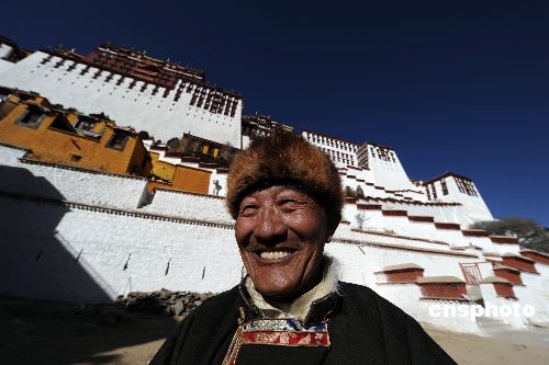 一月十九日,西藏立法機構通過一項議案,決定把每年三月二十八日設為西藏“百萬農奴解放紀念日”,以紀念五十年前在西藏進行的民主改革。圖為拉薩布達拉宮雪城前,現年七十三歲的昔日農奴益西洛追得知此訊表示非常高興。中新社發 廖攀 攝