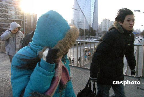 2009年1月22日,在京城東三環的跨線橋上,行人冒著寒風趕路。此前北京市氣象臺第二次發布寒潮藍色預警,北京市將刮起4到5級北風,最高溫降幅將達到10℃左右,周五凌晨平原地區最低氣溫將降至-14℃。中新社發 馬毅行 攝