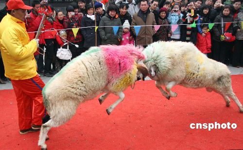 2月2日,影視基地河北正定榮國府里游人好奇地欣賞斗羊表演。1月28日(農(nóng)歷正月初三)至2月8日(農(nóng)歷正月十四),第二屆春節(jié)大廟會在古城河北正定舉行,各種精彩表演及豐富的民俗文化活動,給游客增添無窮歡樂。中新社發(fā) 翟羽佳 攝