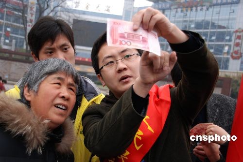 2月24日上午,反假貨幣“壁壘行動”在江蘇鎮江大市口廣場啟動。據悉,由中國人民銀行鎮江市中心支行組織全市各金融機構以及公安部門將進行為期三個月的反假貨幣宣傳活動,活動還將成立反假宣傳小分隊深入到社區、商場、農貿市場、車站、農村等地向群眾宣傳反假幣知識和相關法律常識。中新社發 封波 攝