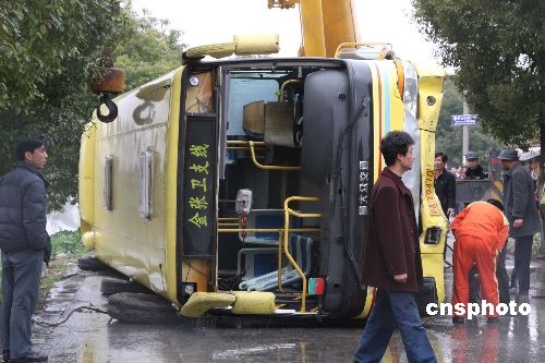 2月24日,上海金山區金山衛鎮秦彎路上,一輛承載多名乘客的公交車不慎沖入河道內,大批乘客被河水淹沒。乘客和司機迅速展開自救行動,最終全部脫離險境。圖為發生事故的公交車被打撈上岸,車窗玻璃破損嚴重,吊車、警車正在現場進行牽引工作。據了解,事故可能與金張衛支線公交車車速過快、避讓不及有關。中新社發 滬選 攝