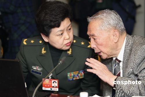 3月4日,全國政協十一屆二次會議進行分組討論,審議政協全國委員會常務委員會工作報告和提案工作情況報告。圖為全國政協委員、著名外科專家吳蔚然(右)與全國政協委員、中國人民解放軍總醫院副院長范利在分組討論上交談。中新社發 盛佳鵬 攝