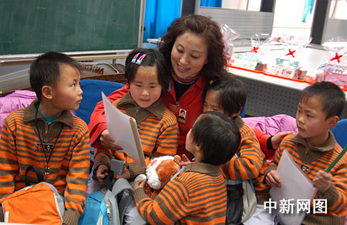 3月4日,在北京豐臺區實驗小學就讀的河北滄州五胞胎繳福慶、繳福森、繳福莉、繳福欣、繳福源迎來7周歲生日,學校為他們舉辦了“快樂與感恩”主題班會。正在北京開“兩會”的黑龍江省全國人大代表蘇艷霞抽閑參加了生日會并向五胞胎贈送了生日禮物,7年來,蘇艷霞女士一直關注著“五福娃”的成長。王少華 張書儉 攝