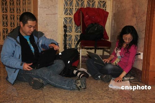3月5日,十一屆全國人大二次會議在北京人民大會堂開幕。圖為在大會堂走廊上,采訪大會的記者席地而坐,爭取以最快的速度傳送稿件。中新社發 張婭子 攝