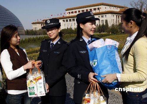 3月6日,首都藝術家協會演職人員及全國推新人大賽獲獎選手,到北京西城公安分局西長安街派出所慰問全國“兩會”值勤女干警,并現場送上“三八”節日的問候及慰問品。中新社發 鄭雄增 攝