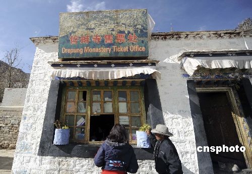 3月10日,游人在西藏拉薩哲蚌寺售票處購買參觀票。當日,哲蚌寺推出半價門票。中新社發 廖攀 攝