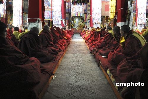 3月10日,西藏拉薩哲蚌寺,僧人們在措欽大殿誦經。中新社發 廖攀 攝