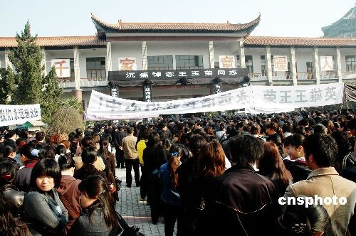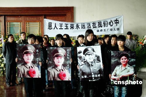 3月18日,王玉榮同志的追悼會在鄭州殯儀館舉行,公安部,河南省市領導及省會各界群眾參加了追悼會。王玉榮3月14日因病在鄭州去世,終年48歲。 王玉榮生前曾迎著歹徒的炸藥包,成功解救28名幼兒和兩名教師,先后參與20多起大要案偵破,獲得過全國公安系統一級英模、全國“三八紅旗手”、全國杰出青年衛士、中國十大女杰等殊榮。中新社發 賈建偉 攝