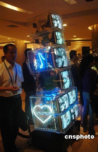 4月17日晚,海南博鰲,博鰲亞洲論壇2009年年會舉行了一場亞洲當代藝術精品展覽,這是該論壇首次開設亞洲當代藝術展覽。此次展覽由博鰲亞洲論壇與藝美基金(Artmia)共同主辦,由中國美術館館長范迪安出任藝術總監。展出中日韓等亞洲多國優秀藝術家的代表性作品二十余件,其中包括張曉剛的油畫《失憶》、曾梵志的版畫《獅子》和油畫《風景》、以電腦影像進行藝術創作的繆曉春的《水起源》,以及越南藝術家阮初芝淳、日本影像藝術先驅澤拓、韓國新媒體大師白南準等人的多件影像作品。圖為展出的韓國新媒體大師白南準的作品。中新社發 尹海明 攝