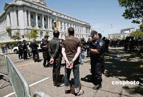 當(dāng)?shù)貢r間5月26日,美國加州最高法院宣布,維持去年十一月四日加州選民通過的禁止同性戀者結(jié)婚的八號提案。法院同時裁決,十一月四日前領(lǐng)取結(jié)婚證書的一萬八千余對同性戀者婚姻合法。最高法院的裁決引起同性戀支持者的強烈不滿,他們在市府大廈前的十字路口靜坐示威,阻擋交通長達數(shù)小時,警方最后逮捕了一百五十余人。中新社發(fā) 陳鋼 攝