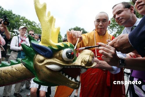 7月23日,美國(guó)紐約香港龍舟節(jié)主辦方在紐約中央公園舉行“點(diǎn)睛醒龍”儀式,宣布第十九屆香港龍舟節(jié)將于8月8日開幕,來自北美各地的一百五十多支隊(duì)伍將進(jìn)行兩天的角逐。主辦方當(dāng)日請(qǐng)來紐約云門寺的明予法師念誦經(jīng)文,給船身灑凈,并用毛筆蘸上紅顏料在船頭龍眼上“點(diǎn)睛醒龍”。中新社發(fā) 孫宇挺 攝