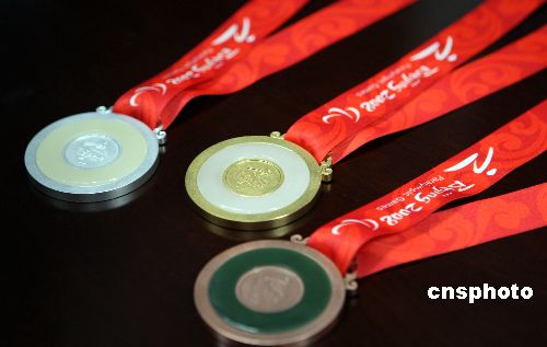 十一月十四日,北京奧組委發(fā)布2008年殘奧會(huì)獎(jiǎng)牌式樣,其設(shè)計(jì)創(chuàng)意、造型與北京奧運(yùn)會(huì)獎(jiǎng)牌一脈相承,體現(xiàn)了“兩個(gè)奧運(yùn) 同樣精彩”的要求。殘奧會(huì)獎(jiǎng)牌正面鑲玉的設(shè)計(jì)靈感來(lái)自中國(guó)古代的玉器造型,中間為北京2008年殘奧會(huì)會(huì)徽;玉的色澤隨金、銀、銅牌有所變化,分別為白玉、青白玉、青玉。中新社發(fā) 任海霞 攝