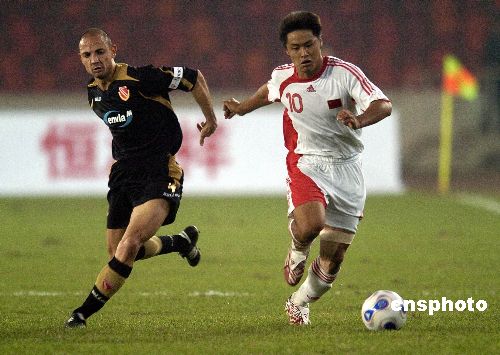 2007年12月18日晚,中國國奧隊(duì)與德甲科特布斯隊(duì)在佛山世紀(jì)蓮體育場交戰(zhàn),終場雙方1比1戰(zhàn)平。中新社發(fā) 吳峻 攝