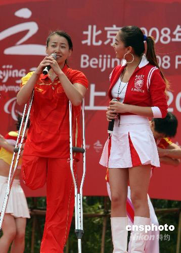 九月一日,北京殘奧會助威團形象大使金晶(左),在上海助陣殘奧會火炬接力活動。當日,北京殘奧會火炬接力“時代風采線”第三站傳遞活動,在上海松江新城大學園區進行,共有六十名火炬手參加。其中,殘疾人員有10名,其余為助殘、幫殘的先進代表和基層殘疾人事業工作者。中新社發 湯彥俊 攝