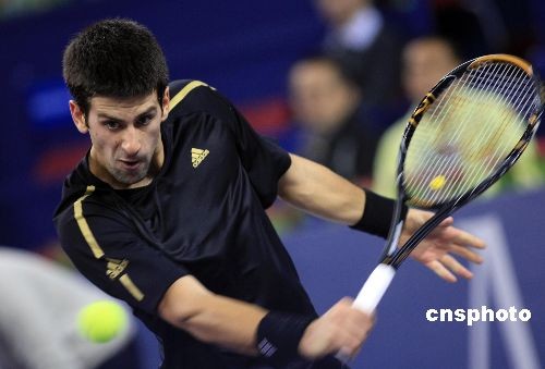 11月9日,2008年上海網(wǎng)球大師杯在上海旗忠網(wǎng)球中心拉開(kāi)戰(zhàn)幕。在當(dāng)日進(jìn)行的金組首場(chǎng)比賽中,塞爾維亞小天王德約科維奇以2比0戰(zhàn)勝阿根廷選手德?tīng)柌ㄌ亓_,迎來(lái)自己在上海網(wǎng)球大師杯上的首場(chǎng)勝利。去年,德約科維奇首次亮相上海網(wǎng)球大師杯,小組賽3戰(zhàn)盡墨。中新社發(fā) 湯彥俊 攝