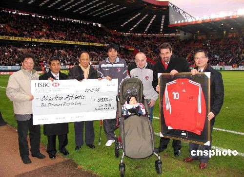 當地時間11月22日下午,倫敦,英冠聯賽第18輪,查爾頓主場迎戰謝菲爾德聯隊。中場休息之際,查爾頓隊中國球員鄭智(左四)現場貢獻出一件親筆簽名的在中國國家隊所披10號戰袍,拍賣所得款項為一位殘疾小球迷購買高級輪椅。英國泗和行集團老板謝貴全(左三)當場慷慨解囊兩千英鎊,拍得該件球衣。中新社發 楊冉 攝