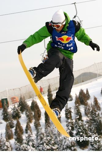 12月28日,第七屆紅牛南山滑雪公開賽在北京南山滑雪場展開資格爭奪,中國近40位單板滑雪高手激烈角逐,最后將有三位勝出的選手在明年一月與世界頂級選手一較高下。中新社發 富田 攝