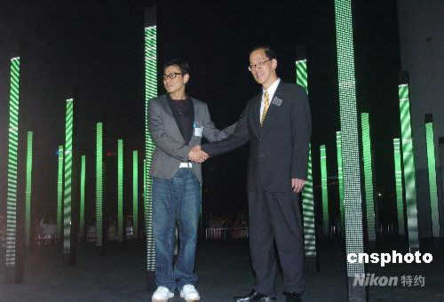 四月十一日晚,由香港藝術發展局主辦、Microwave籌辦的“燈陸‧亞高高”聲光互動媒體藝術展在香港尖沙嘴星光大道開幕,民政事務局局長曾德成與影星劉德華在揭幕后,率先體驗由英國著名國際藝術團隊United Visual Artists (UVA)創作的“Volume”所帶來的視聽覺體驗。中新社發 鄧慶樂 攝