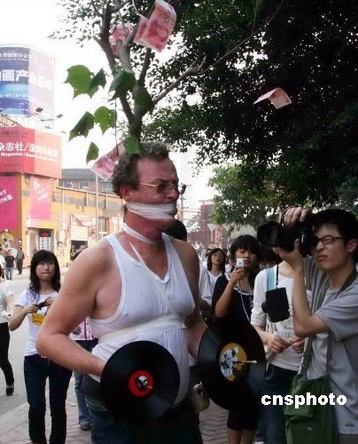 10月17日,來自法國、瑞典、荷蘭、日本、美國、新加坡及中國的20多位藝術家在重慶上演了一場行為藝術秀。圖為一荷蘭藝術家背著掛滿百元大鈔的樹丫,捆綁住自己走上街頭。中新社發 孟幻 攝